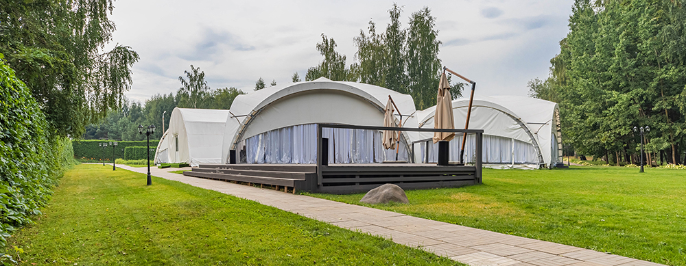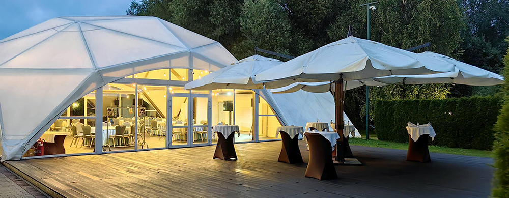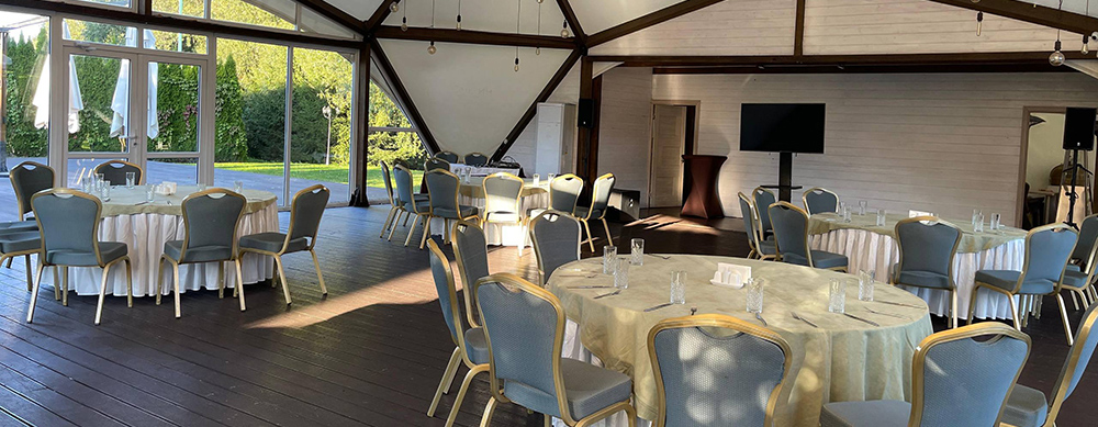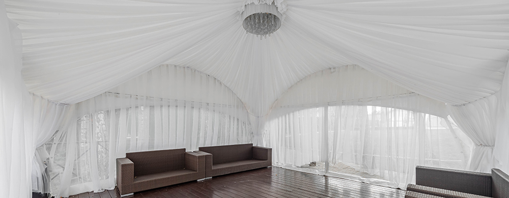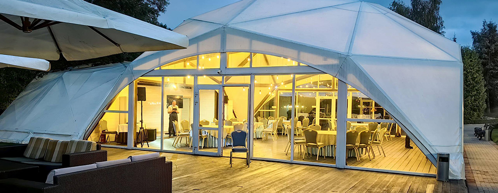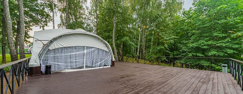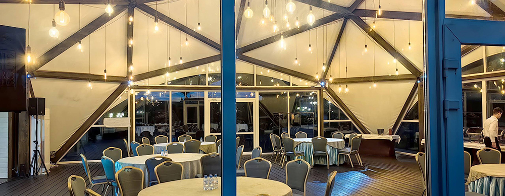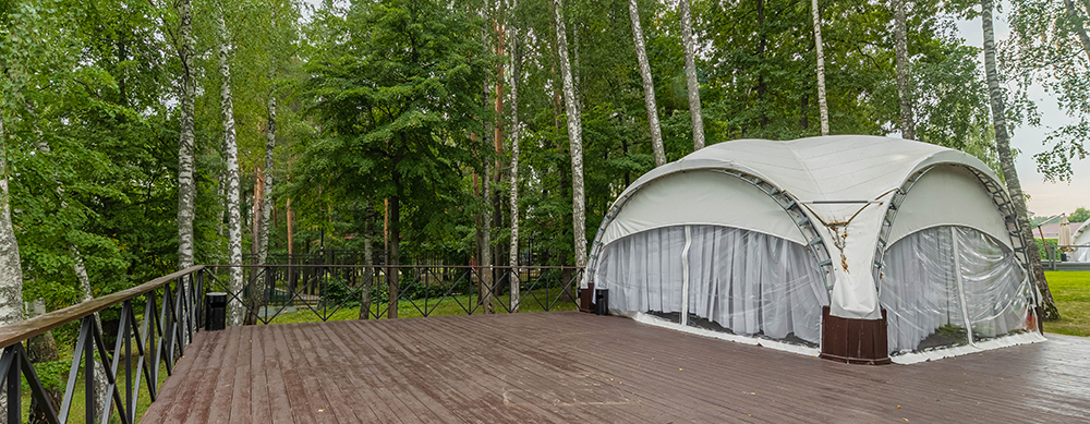 Камерный шатер, площадью 36 кв. м., вмещает до 18 человек. Идеально подходит для банкетов и празднований значимых жизненных событий.
