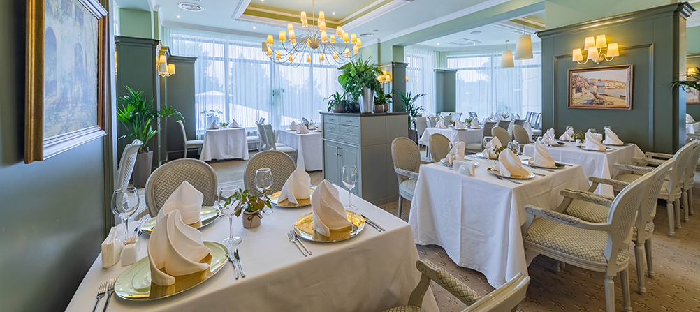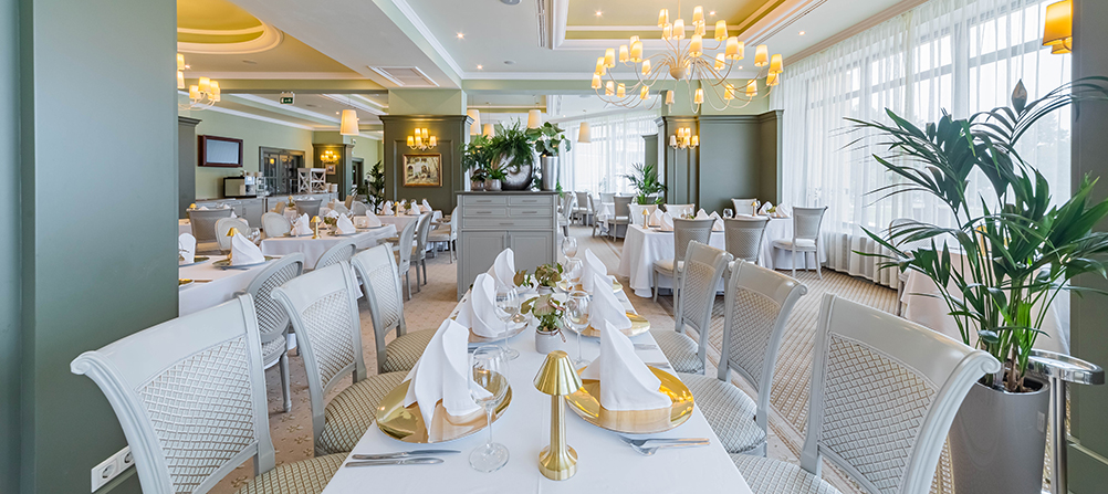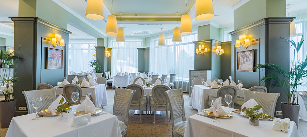 Каждое утро сервируется завтрак «шведский стол», с богатым выбором закусок русской и европейской кухонь, разнообразием сыров, различными мясными и рыбными нарезками, свежей выпечкой, отменным кофе и свежевыжатым соком без ограничения.